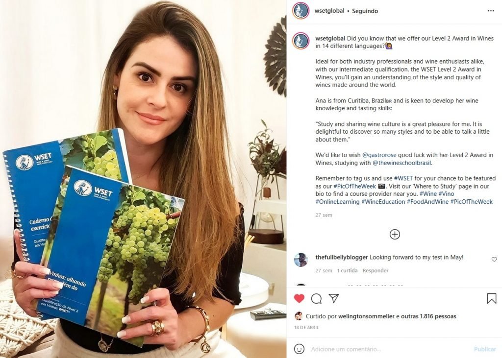 Fomos destaque em 18/04/2021 na página da Wine & Spirit Education Trust no Instagram, quando a Ana iniciou os estudos para a qualificação internacional WSET Level 2 em vinhos.
