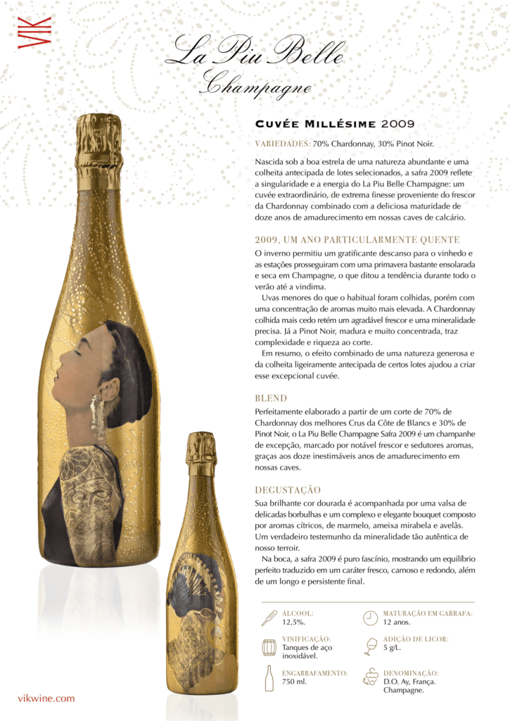 La Piu Belle Champagne se sobressai tanto por sua qualidade quanto pela aposta inovadora. É um verdadeiro reflexo da linha artística que caracteriza a VIK e surpreende o mercado com seu lançamento global.